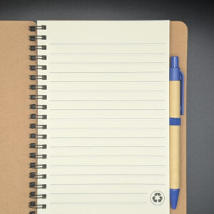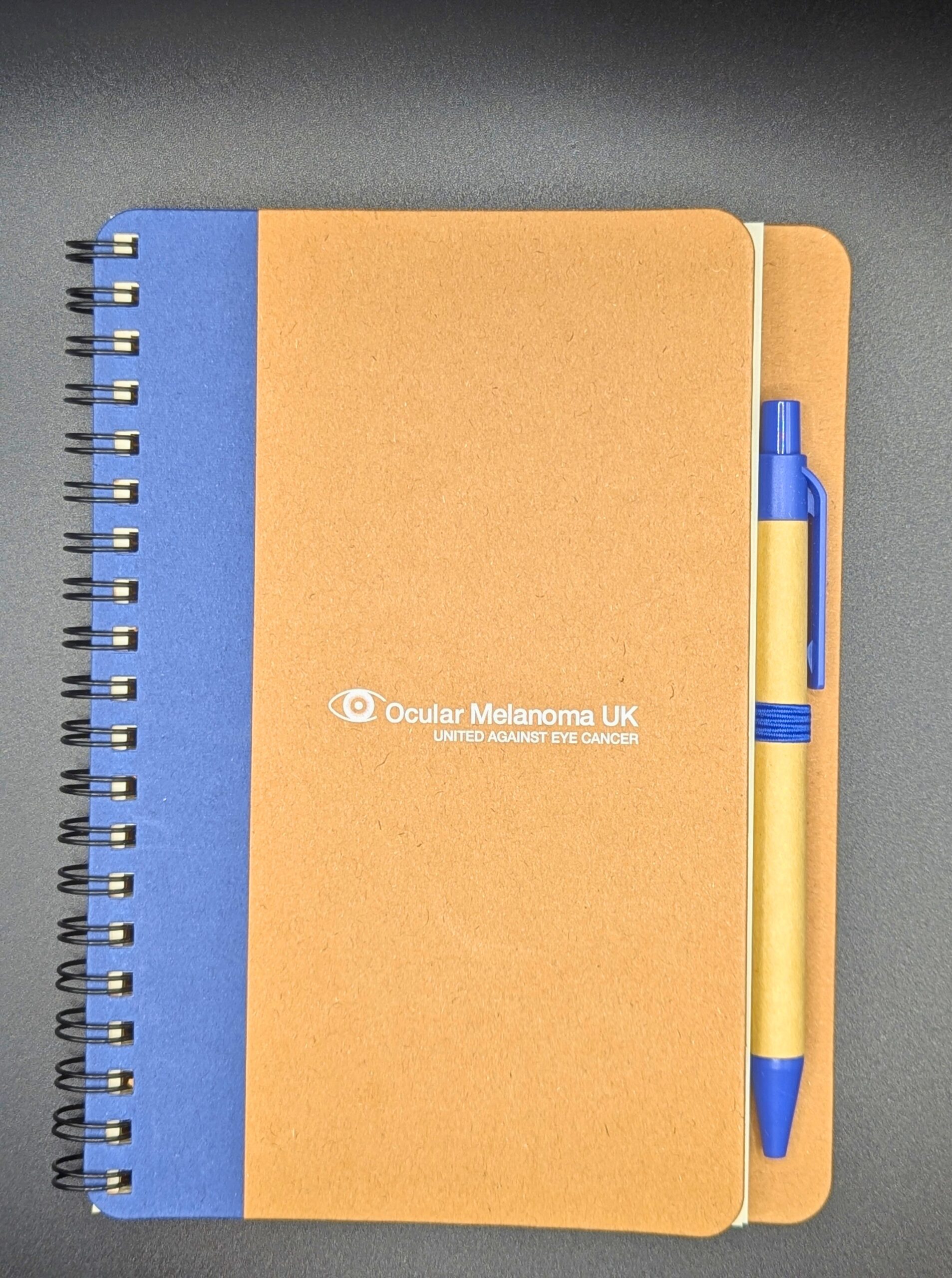 New and improved style Ocular Melanoma UK branded notebook with pen. Recycled paper cover notebook with 60 sheets of lined recycled paper with matching pen.